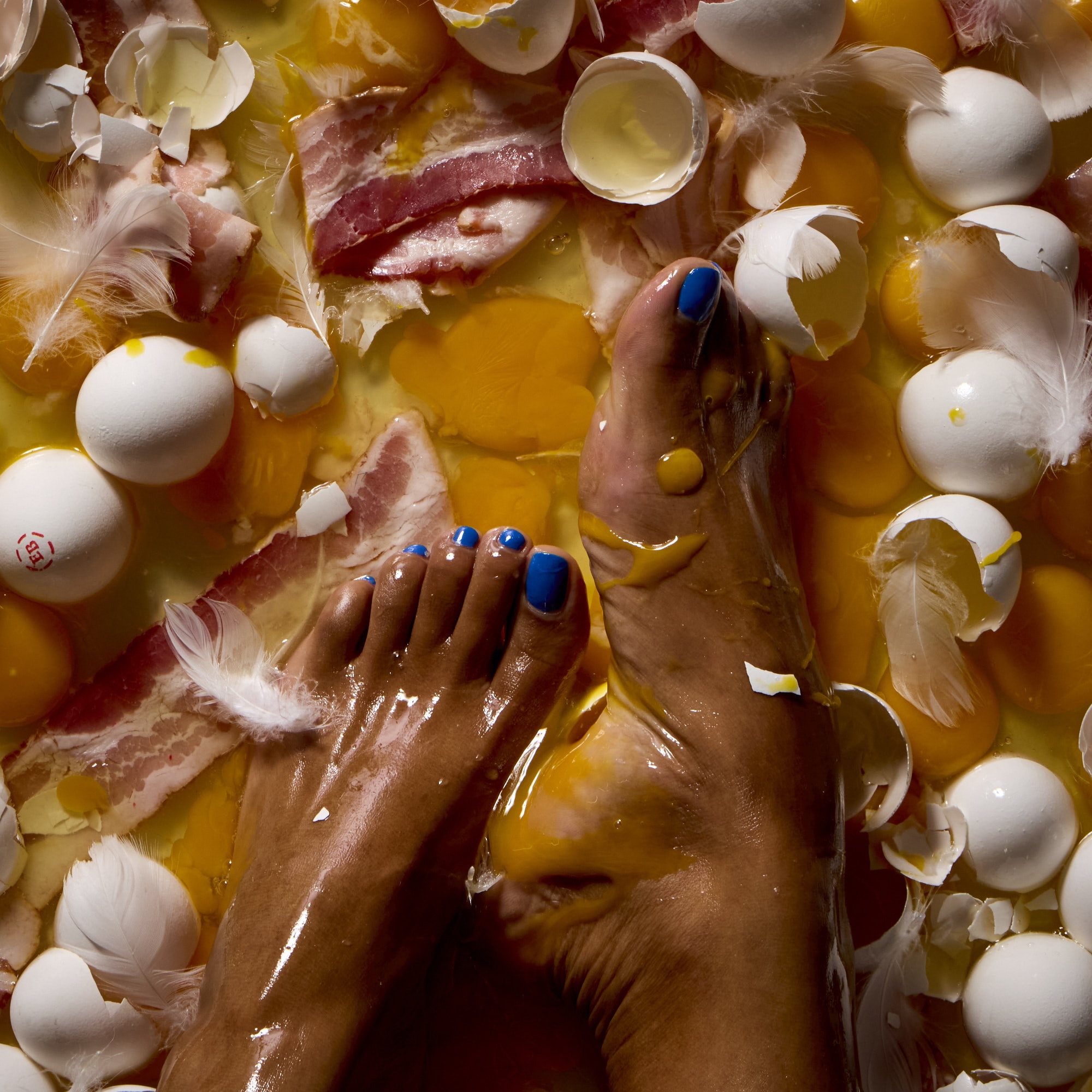 Henry Hargreaves’ photography transforms food into a storytelling medium, far removed from traditional culinary imagery. In No Seconds, he recreates death-row inmates’ last meals—simple dishes like fried chicken or pie—using their stark presentation to reflect on mortality and justice. Conversely, Burning Calories features deep-fried gadgets like iPhones, critiquing consumerism with a surreal twist. His aesthetic is bold, with vibrant colours—hot pinks, electric blues, greasy yellows—set against clean or dark backgrounds for maximum impact. Textures are key: slick fried surfaces or gooey melts add a tactile layer, making his images feel alive and provocative.