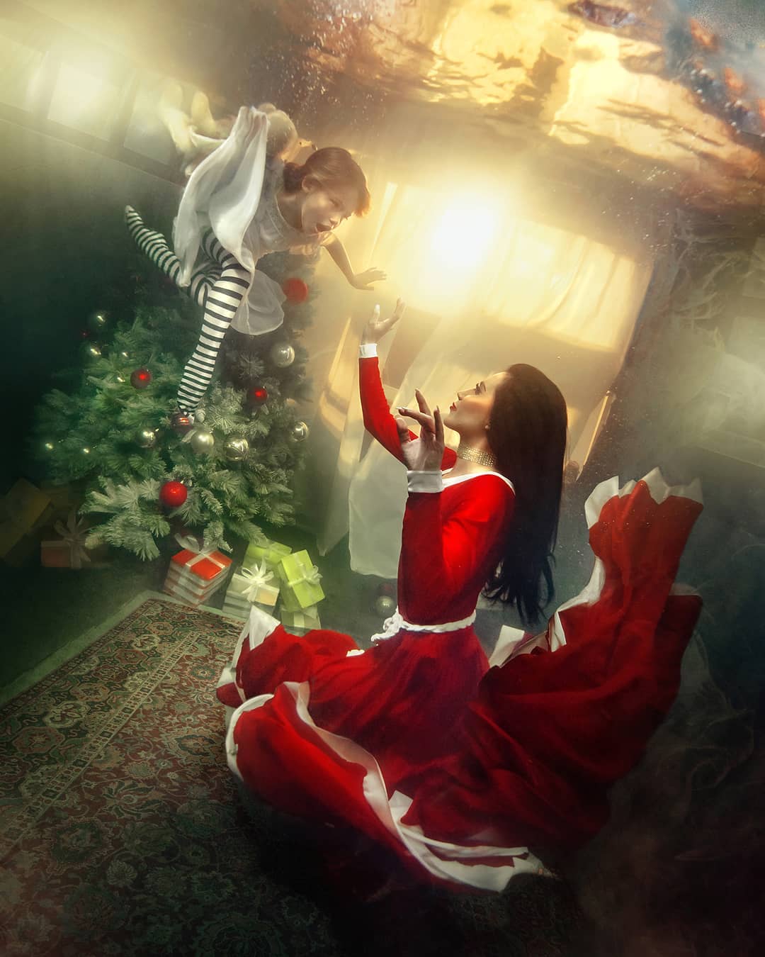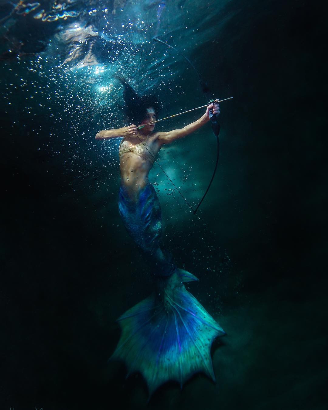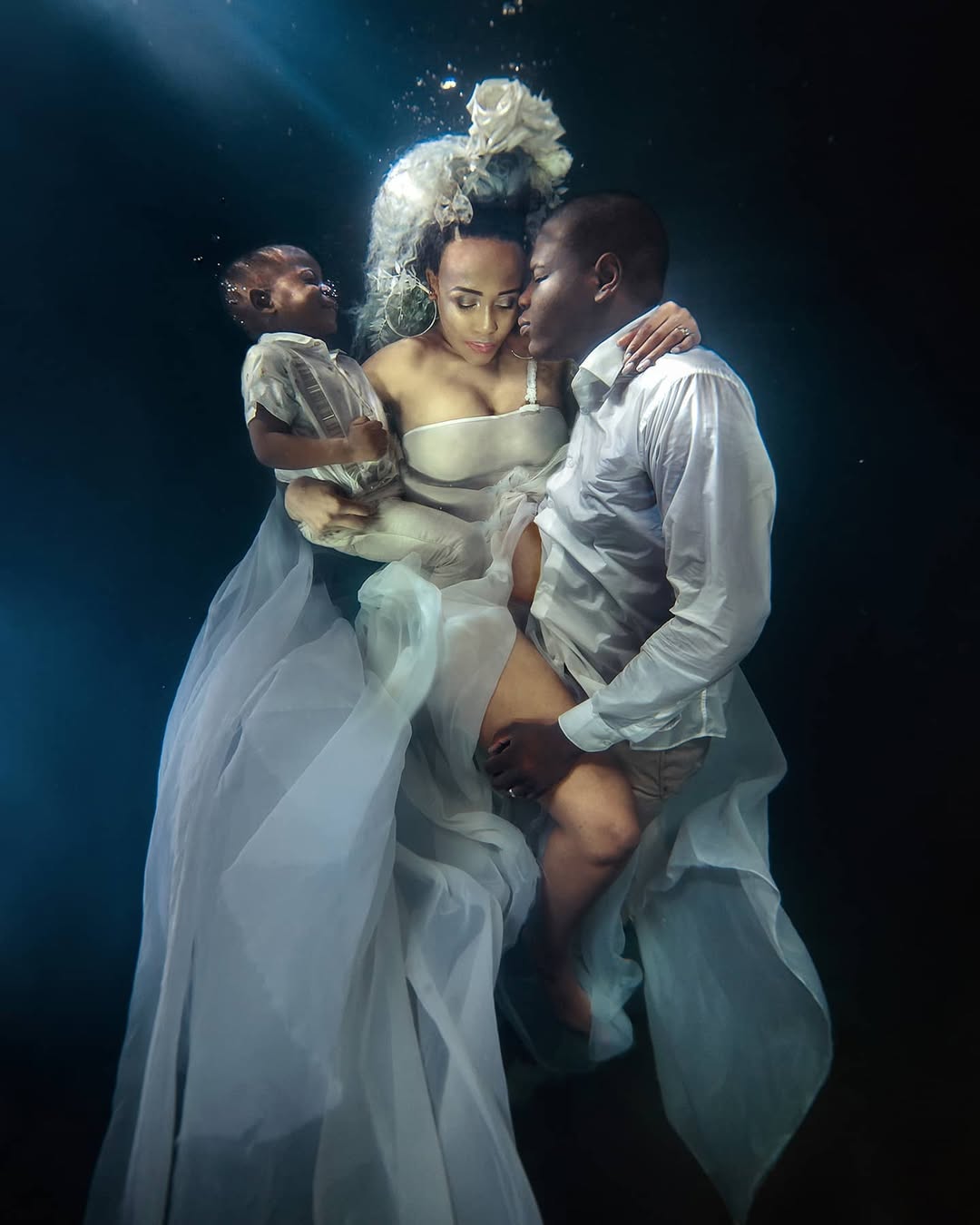 Moore’s common subjects are people in underwater settings, including portraits, maternity sessions, and fashion models, often posed in pools or studios to highlight themes of transformation and freedom. Her aesthetic emphasises dark, dramatic contrasts with vibrant blues, greens, and shadows, where textures like flowing fabrics or hair add to the sense of motion and mystery. Techniques involve digital cameras in waterproof housings, wide-angle lenses for expansive views, and directing models for hours to achieve natural poses without bubbles, using pool depth around 2 metres for control. She relies on natural sunlight filtered through water or diffused strobes for soft, even lighting that enhances mood without harsh highlights. Editing in Photoshop focuses on boosting contrast, cooling colours, and adding subtle haze for cohesion, keeping adjustments minimal to retain the scene’s authenticity. Presentations include online galleries for prints up to A2 size, commercial commissions, and exhibitions in South African art spaces.