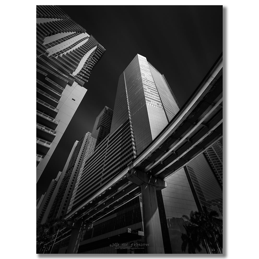 Gospodarou’s work centres on architectural subjects, ranging from modern skyscrapers to ancient ruins like the Acropolis. Her aesthetic is minimalist, with deep greys and stark contrasts that bring out textures like concrete or steel. She shoots digitally, using tilt-shift lenses for precision and long exposures (10-300 seconds) with neutral density (ND) filters to blur motion and enhance form.