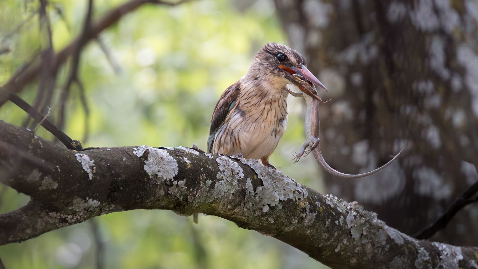 Brown hooded kingfisher with striped skink.